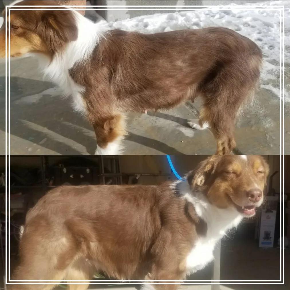 After a month sick with a stomach bug & years of dull, flaky skin needing weekly medicated baths, Dean’s now thriving with Life's Abundance—full weight, shiny coat. Look at the before and after! ~ Lindsay Judson
